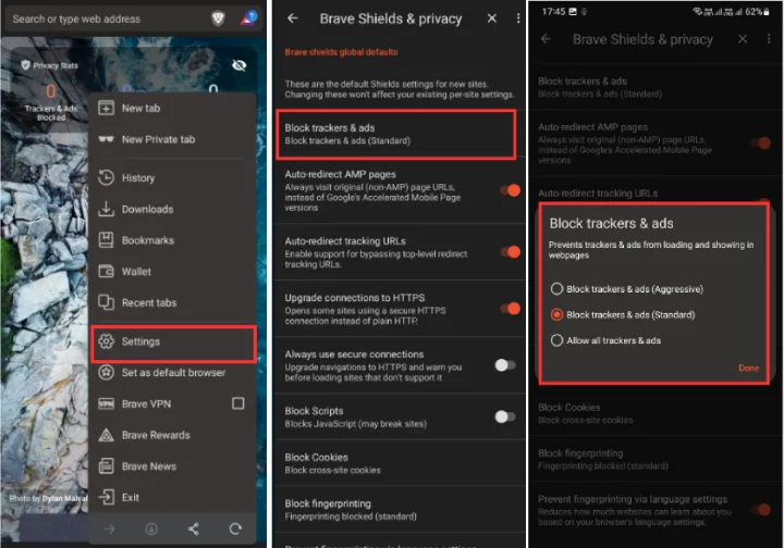 - Activate Brave Shields: Click on the settings menu, you will find an option called “Shields.” Tap on it to access the Brave Shields settings. You enable the browser’s built-in ad-blocking feature by toggling it on, which blocks pop-up ads and other unwanted content.
